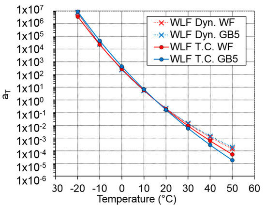 Shift factors of the WLF equation (Equation (7)) obtained from the tension–compression tests (WLF T.C.) and from the dynamic tests (WLF Dyn.) for the two tested materials.