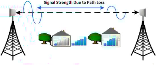 There are two primary limitations to the performances of the 4G mobile communication systems: time and location. The new 5G technology, with 28 and 38 GHz mm wave frequencies, address these limitations []. Amongst the channel characteristics, signal paths change is the most critical parameter. The path loss is defined as a decrease in the signal strength during propagation from the transmitter to the receiver []. Several effects may cause the path loss, such as reflection, refraction, diffraction, absorption, coupling, and cable loss []. The path loss inside the building is also influenced by many factors, including the propagation medium, environment, height of the antennas, and the distance between the transmitter and the receiver inside the building [,]. Figure 1 shows the effect of path loss on the received signal power over an urban area and inside building obstacles. However, there is a clear relationship between the signal strength and the temperature. In general, when the temperature increases, the Received Signal Strength Indicator (RSSI) drops []. Naturally, the relative humidity increases and drops based on RSSI, which is dependent on a positive relationship with the trend of Absolute Humidity (AH), indicating a negative correlation []. If the size of a window is large the signal will be high; if the window size decreases, the signal will decrease [,].