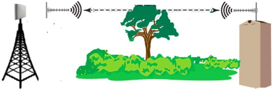 NLOS refers to the path of propagation of a radio frequency (RF) that is obscured (partially or completely) by obstacles, thus making it difficult for the radio signal to pass through (Figure 2). Common obstacles between radio transmitters and radio receivers are tall buildings, trees, physical, scape, and high-voltage power conductors. While some obstacles absorb and others reflect the radio signal; similarly, they all limit the transmission ability of signals (Figure 2) [].