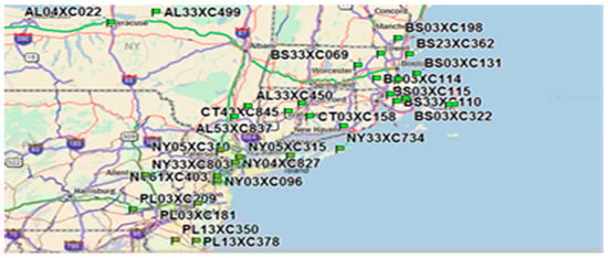 The signal was measured at 28 GHz RX at the University of Bridgeport, Connecticut, USA (see Figure 3 for different locations). The green dots in Figure 3 show the distances at the TX locations, which went up to 300 m. For RX locations, we used half-power Beam width antennas (HPBW) with 25.3 dB (11.2° HPBW) and 16 dB (28.9° HPBW) gain antennas at the TX and RX for the largest range of measurement of 184 dB incoming signals from different angles of arrivals. The data measurement was collected over distances of 25 to 500 m but was cut from 20 to 251 m based on the power failure [].