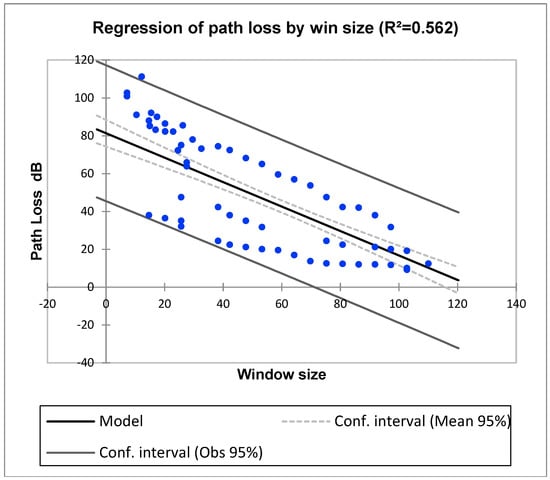 Based on the linear regression technique on the window size parameter, using a TYM model in Figure 4, shows the regression of the path loss by the window size with coefficients (0.562). If the size of the window is big, the path loss will be low, which means the relation is negative.