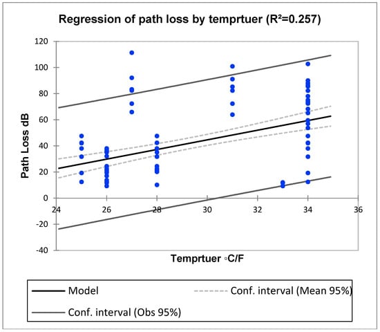 Based on the linear regression technique on the temperature parameter, Figure 7 shows the regression of the path loss by the temperature with coefficients (0.257). When the temperature increases, the signal strength (RSSI) drops, and if the temperature decreases, the signal strength increases. This outcome specifies a negative relationship between the signal strength and the temperature.