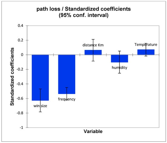 Based on the linear regression technique on the frequency parameter, Figure 8 shows the regression of the path loss by the frequency with coefficients (0.366). When the frequency increases, the signal strength (RSSI) drops, and when the frequency decreases, the signal strength increases. This outcome specifies a negative relationship between the signal strength and the frequency.