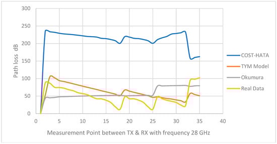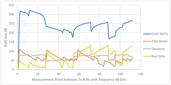 Figure 11 shows the output result from the three reference models including the real measurement. The Okumura, COST 231 HATA, and TYM models are compared to the measured data. Figure 10 and Figure 11 clearly shows that the TYM model has a higher accuracy than the other models, due to its flexibility between high and low frequencies. Meanwhile, the Okumara model only works only with low frequencies. The Okumara model is better than the COST-Hata model, however, because the COST-Hata works exclusively with limited frequencies. Both the Okumara and COST-Hata models only focus on outside environments, while the TYM model works with outdoor environmental factors such as humidity and temperature in addition to indoor environmental factors such as window size. Additionally, the TYM model worked with 5G, while the Okumara and COST-Hata models did not.