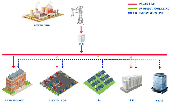 The system architecture considered in this work is shown in Figure 1. It consists of an educational building with laboratories (engineering building 2–7), a smart parking lot with 100 charging/discharging stations, PV panels, and an ESS. The power grid is connected to the system through a point of common coupling (PCC). The power grid supports the electric power for both the building and the parking lot. The university energy management system (UEMS) is a local controller responsible for serving both the building’s energy demands as well as EV demands. The UEMS receives monitoring data from different sub-systems through communication networks. The major roles of the UEMS are: