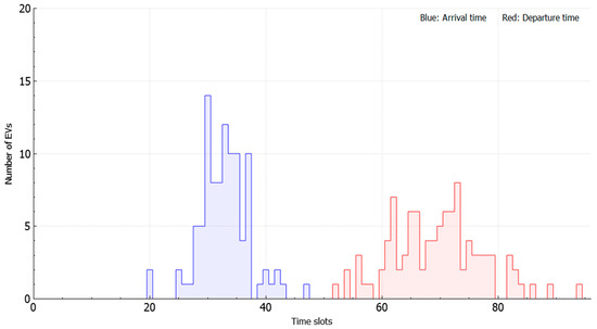 Arrival and departure time of 100 electric vehicles (EVs) at the university parking lot.