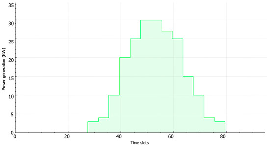The PV panels are used to convert the sunlight to electricity. The position of the PV surface should be perpendicular to the sunlight. The output power during the day may be different based on solar irradiation, temperature and weather conditions. Equation (2) shows the output power of the PV system where η is the conversion efficiency of PV cells, S is the surface area of the PV surface, I is the solar radiation and Ta is the ambient temperature [29]. Figure 4 shows the predicted output power of PV panels considered in this work.