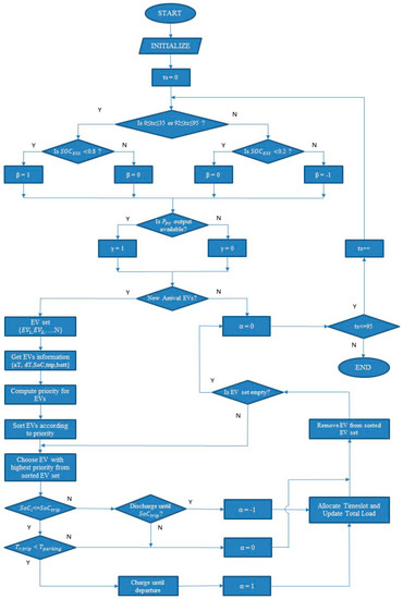 In this work, the proposed optimal energy management algorithm (OEMA) assigns different priorities to EV charging by considering the status of the building’s power consumption, PV output and ESS. We assume that time is slotted and indexed by an integer in T = {1,2, 3, …, T}, where T is the time-period. The time-period is 24 h consisting of time slots. The time slot size (∆ts) is 15 min. The main objective of this work is to minimize EV charging costs while balancing the load profile of the power grid. We calculate the required number of charging timeslots (Nt) for each EV based on Equation (8) where SOCreq is the desired SOC of the EV battery for the user for the next trip (departure time), Bev is battery capacity, Pc is charging rate and η is the coefficient of charging power rate.