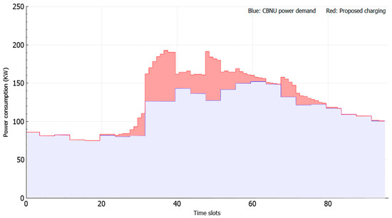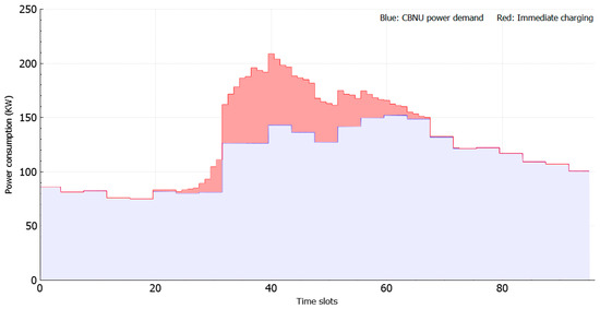 In immediate charging, EVs start charging directly upon arrival without any attempt to schedule or organize their needs. Figure 6 shows the result of the uncoordinated charging scheme where 100 EVs were charged immediately after arriving at the parking lot. The peak power consumption was about 208 kW at 11.00 a.m. The charging load of the EVs coincided with the building’s daily peak demand hours. Both the PV system and the ESS were not configured in this scenario. The result showed that the impact of EV charging on the building power consumption was very severe.
