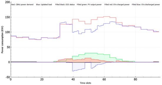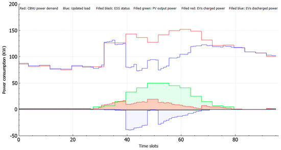 Scenario four was an extension to scenario three, considering a system configuration with 100 EVs, a PV system of 30 kWh and an ESS of 50 kWh. The output power from the PV system was enough to decrease the building’s power consumption during the period between 11:00 a.m. and 8:00 p.m., as shown in Figure 9. As the number of EVs had been doubled compared to scenario three, there was an increase in the building’s power consumption at 9:00 a.m. Peak power consumption was about 132 kW. This increase was due to the low charging costs during the mid-peak from 9:00 a.m. to 10:00 a.m.