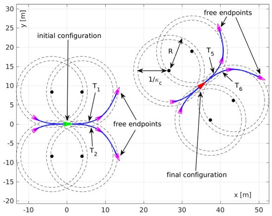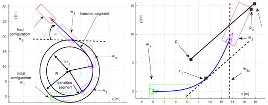 - The four possible transition segments starting at the prescribed initial vehicle body configuration are computed (Curve (7)). They correspond to forward motion with curvature , forward motion with curvature , backward motion with curvature , and backward motion with curvature . See Figure 5 for visual interpretation.