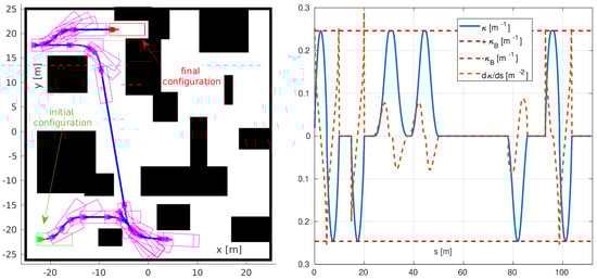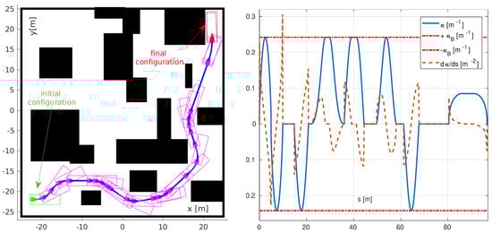 - Parlangeli, G.; Ostuni, L.; Mancarella, L.; Indiveri, G. A motion planning algorithm for smooth paths of bounded curvature and curvature derivative. In Proceedings of the 17th Mediterranean Conference Control and Automation, Makedonia Palace, Thessaloniki, Greece, 24–26 June 2009; pp. 73–78. [Google Scholar]