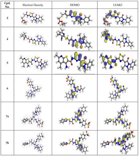 The electron density, the highest occupied molecular orbital (HOMO) and lowest unoccupied molecular orbital (LUMO) frontier orbitals of 4-antipyrinylthiazole derivatives 2, 4, 5, 6, and 7.