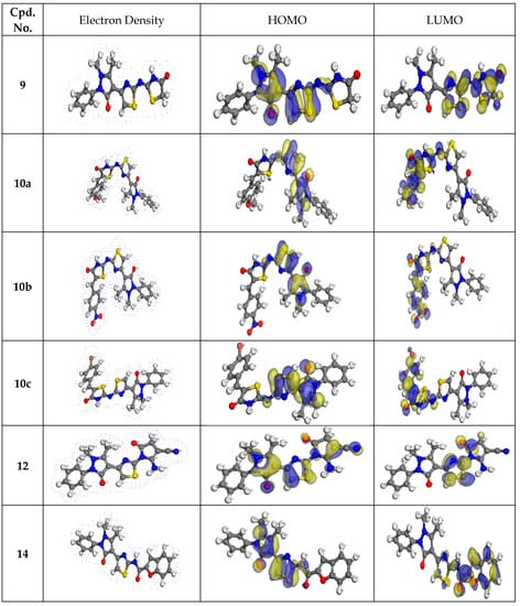 The electron density, the HOMO and LUMO frontier orbitals of 4-antipyrinylthiazole derivatives 9, 10, 12, and 14.