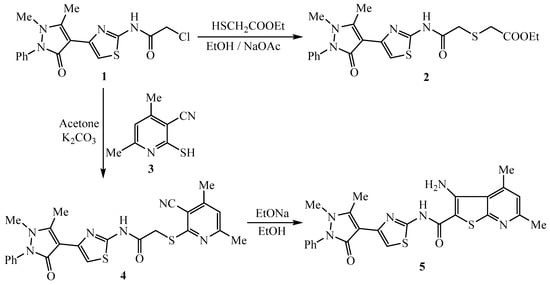 Reaction of thiazolyl-chloroacetamide 1 with ethyl thioglycolate and 3-cyano-4,6-dimethyl-2-mercaptopyridine.