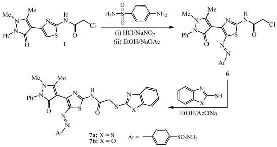 The reaction of 2-chloroacetamido-thiazole derivative 6 with 2-mercaptobenzothiazole and/or 2-mercaptobenzoxazole was achieved by refluxing in ethyl alcohol and sodium acetate for 2 h to furnish the corresponding sulfide derivatives 7a and 7b, respectively. The chemical structures of 7a and 7b were deduced from their compatible spectral and elemental analyses.