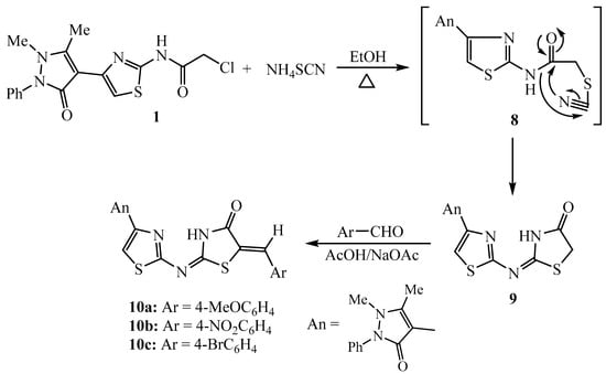 Treatment of the key compound 1 with ammonium thiocyanate in refluxing ethanol has been described to furnish 2-((4-antipyrinylthiazol-2-yl)imino)thiazolidin-4-one (9). A plausible mechanism for the reaction is indicated in scheme 3. The reaction proceeds via intramolecular cyclization of the thiocyanate intermediate 8 and the Dimroth-like rearrangements [31]. The product of this reaction was designed as the lactam derivative 9 and finds support from the literature of Vicini et al. [32]. The constructed thiazolidin-4-one scaffold 9 underwent condensation with three para-substituted benzaldehyde derivatives in glacial CH3COOH and anhydrous CH3COONa (Knoevenagel condensation reaction) furnishing the corresponding 2-(4-antipyrinylthiazol-2-ylamino)-5-(substituted-benzylidene)-thiazol-4(5H)-one derivatives 10a–c in good yields, see Scheme 3. The chemical structures of 10a–c were determined based on their compatible spectral analyses. Thus, the IR spectrum of 10a showed the characteristic absorptions at 3176 and 1698 cm−1 referring to the functional groups -NH- and carbonyl (C=O), respectively. The 1H NMR spectrum of the same scaffold exhibited a singlet for three protons at δ 2.61 ppm (CH3-C), a singlet for three protons at δ 2.28 ppm (CH3-N), a singlet for three protons at δ 3.84 ppm (OCH3), and a doublet for two protons at δ 7.14 ppm (aromatic protons). The aromatic and thiazole C-5 protons resonated as a multiplet (δ 7.28–7.62 ppm), the olefinic proton resonated as a singlet at δ 7.73 ppm, while the proton on N-H function resonated as a singlet at δ 12.62 ppm. In compounds 10a–c, the Z conformation of the exocyclic C=C double bond was assigned on the basis of 1H NMR spectroscopy and on the basis of literature data for analogous 4-thiazolidinones [33]. The 1H NMR spectra of compounds 10a–c showed only one kind of methine proton that, deshielded by the adjacent C=O, was detected at 7.73–7.78 ppm, which are higher chemical shift values than those expected for E isomers.
