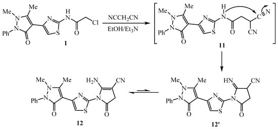 Condensation reaction of equimolar amounts of chloroacetamido derivative 1 and malononitrile in absolute ethyl alcohol containing a few drops of triethylamine afforded the corresponding condensation product 2-amino-1-(4-antipyrinylthiazol-2-yl)-3-cyano-4,5-dihydro-5-oxo-1H-pyrrole (12) which was identified based on its compatible spectral analyses, see Scheme 4. Thus, the infrared spectrum of compound 12 exhibited the characteristic absorptions at 3293, 3191, 2216, and 1705 cm−1 related to the functional groups amino (NH2), nitrile (C≡N), and carbonyl (C=O), respectively. In the 1H NMR spectrum, the protons of two methyl, methylene, thiazole-H5, and amino functions were secured by the presence of their characteristic signals at δ 2.65 ppm (singlet), δ 3.32 ppm (singlet), δ 4.36 ppm (singlet), δ 7.29 ppm (singlet), and δ 12.47 ppm (singlet), respectively.