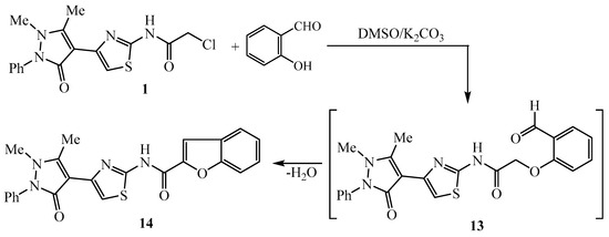 Treatment of chloroacetamide derivative 1 with salicylaldehyde in DMSO containing potassium carbonate was achieved by stirring the reaction mixture for 8 h followed by neutralization with dilute HCl to furnish N-(4-antipyrinylthiazol-2-yl) benzofuran-2-carboxamide (13). It was reasoned that the chlorine atom in acetamido derivative 1 could be substituted by nucleophiles, so the plausible pathway for the formation of benzofuran derivative 14 could be via formation of intermediate 13, which subsequently underwent a condensation reaction between the formyl and active methylene group, see Scheme 5. The structural proof of compound 14 was determined based on its correct spectral analyses. Thus, the infrared spectrum of compound 14 showed absorptions at 3369 and 1689 cm−1 to secure the functional groups (N-H) and (C=O), respectively. The 1H NMR spectrum clearly indicated the presence of a singlet for three protons at 2.62 (CH3-C), a singlet for three protons at 3.33 (CH3-N), a singlet for one proton at 7.28 ppm (thiazole-H5), a multiplet for ten protons in the region of δ 7.36–7.71 ppm (aromatic-H and furan-H3), and a singlet for one proton at δ 12.31 ppm (NH).
