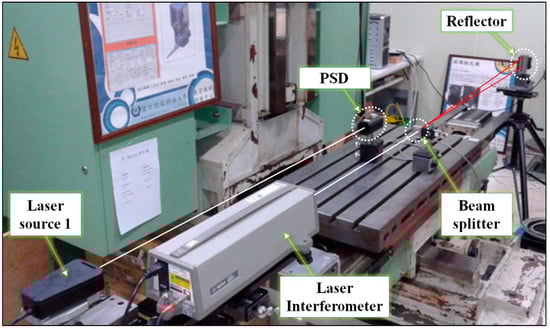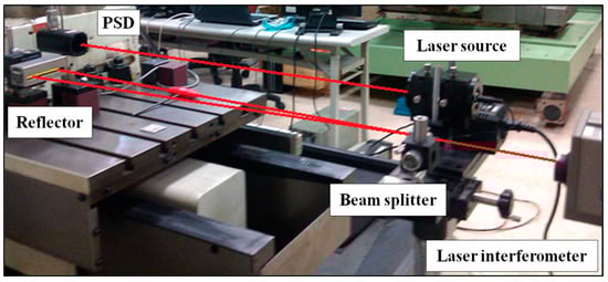 The verification of the vertical straightness of the proposed system was conducted by using the laser interferometer, which was also utilized for PSD calibration, as a reference to measure the vertical straightness errors of the in-house-developed three-axis machine tool in an air-conditioned laboratory, as shown in Figure 10 and Figure 11.