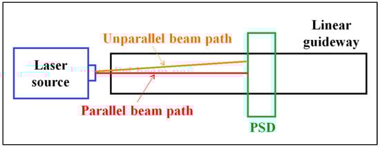 Fan et al. [] proposed a low-cost straightness measurement system using a laser source and a quadrant detector. Lin et al. [] integrated a dual-linear reflector, a Wollaston prism, and a corner cube to establish a measurement system of repeatability (3σ) of 1 μm. In a similar way, Feng [] and Kuang [] utilized a single-mode fiber-coupled laser module as the reference line for straightness measurements. Hwang et al. [] proposed a three-probe system for measuring the parallelism and straightness of a pair of rails for ultra-precision guideways. Iqbal et al. [] first described how randomly arising illumination noises produce unpredicted variations in the position sensing detector (PSD) output. You et al. [] proposed a straightness error measurement approach based on common-path compensation in order to eliminate the laser beam drift by utilizing an optical module with a PSD and a quadrant detector (QD).