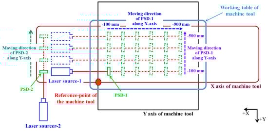As shown in Figure 7, the measurement path was inspired by previous study []. The straightness variation of the moving working table is detected by PSDs. The laser beam of the 2nd module is utilized not only as the reference line projected on PSD-2 for measuring the vertical straightness errors of the Y-axis, as shown in Figure 3, but also as the connection for linking the errors measured by the 1st module. The reference-point of the machine tool is at the left down corner, and the measurement was performed in horizontal motion along the X-Y plane of the machine tool. The moving direction of PSD-1 along the X-axis was from machine position X—100 mm to X—900 mm (measurement distance: 800 mm), and the PSD-1 along Y-axis was from Y—100 mm to Y—500 mm (measurement distance: 400 mm).
