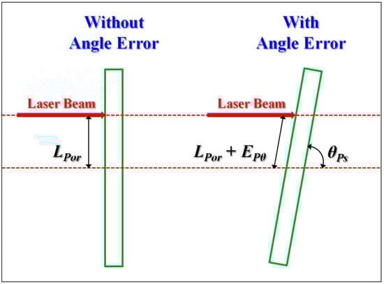 During the PSD setup process, a pitch/yaw angle error could exist due to PSD fixture, machine operation, misalignment, and so on, which may result in a cosine error in the X- or Y-axis, as shown in Figure 9. The PSD setup error can be expressed as: