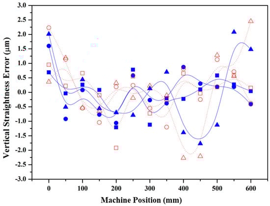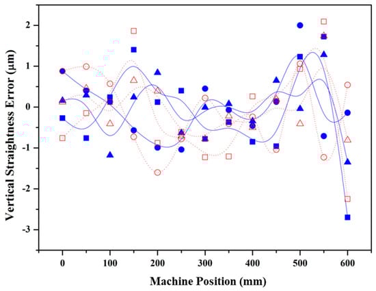 Vertical straightness errors of single-axis measurement verification: ■▲●—laser interferometer, and □△〇—proposed system.