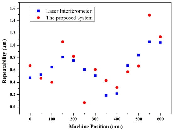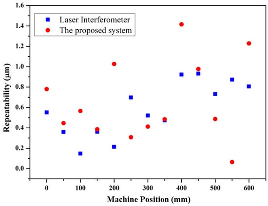 Figure 12 and Figure 13 show the vertical straightness errors and repeatability of single-axis straightness measurements, and Figure 14 and Figure 15 show those of dual-axis straightness measurements. Table 4 compares vertical straightness verification results of the laser interferometer and the proposed system. The repeatability (3σ) of the laser interferometer and the proposed system were 2.32 μm and 2.32 μm for single–axis measurements, and 2.32 μm and 2.46 μm for dual-axis measurements.