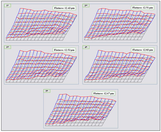 With the errors compensated by the proposed system, the matched high-points in the dash windows was conspicuously improved, evidencing the cancellation of vertical straightness errors originated from the moving working-table could be a significant benefit for surface topography measurements. Furthermore, both the average flatness and accuracy repeatability (3σ) were also improved from 64.65 μm to 52.14 μm and from 2.13 μm to 1.46 μm, respectively, as shown in Table 5, which proves the system’s feasibility for increasing the accuracy and precision of surface flatness measurements.