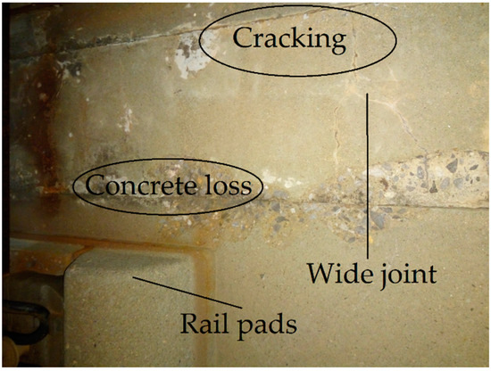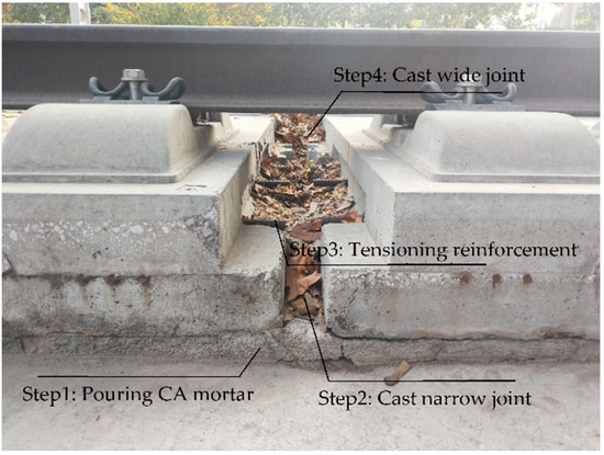 Although the slab track has gained successful improvements and applications in high-speed railway lines compared with traditional ballasted tracks, the slab track still sustains some structural damage caused by train load and temperature load in the operation process. In practice, the wide and narrow joints between the track slabs have presented deficiencies, such as concrete loss and damage, and cracking at joints (shown in Figure 2) and arches, etc., in recent years. The longitudinal continuity and stability of the ballastless track are seriously weakened by the damage to the wide and narrow joint position. Therefore, it is necessary to study the mechanism of wide and narrow joint issues and to provide solutions for such joints’ maintenance and repair.