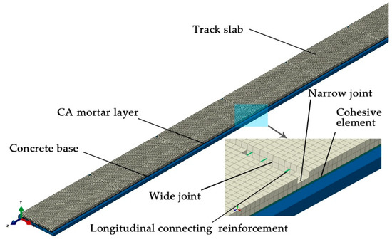 The ballastless track is suitable for high-speed railways because it provides great smoothness and stability for the railway line, and has the advantages of high structural stability, good stiffness uniformity, long service life, and little maintenance work compared with the conventional ballast-track [1,2]. Figure 1 shows the CRTSII slab track and its components. The primary components of the slab track system are the rails, rail pads, track slab, cement-emulsified asphalt (CA) mortar layer, and concrete base. The CRTSII slab ballastless track is connected longitudinally between track slabs by tensioning the longitudinal connecting reinforcement between track slabs, and casting wide and narrow joint concrete [3]. The tensioning of longitudinal reinforcement plays a role in ensuring the longitudinal connection reliability of the ballastless track and limiting the crack width at wide and narrow joints. According to the original design concept [4], the tensioning of longitudinal reinforcement generates 300 kN of pre-pressure, which can effectively reduce the crack width and the stress of the connecting reinforcement on wide and narrow joint concrete. The wide and narrow joint is an important link in the longitudinal system of the CRTSII slab ballastless track.