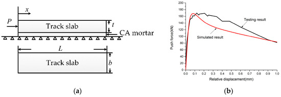 The load–displacement curve of the interface was obtained by a slab push test on single rail pads carried out by the China Academy of Railway Sciences Corporation Limited (CARS). In order to get the parameters of the interface element, a three-dimensional finite element model was established according to the actual size and constraint mode of the single rail pads push slab test (shown in Figure 7a). L = 2.55 m, b = 0.65 m, and t = 0.2 m. The loading method was simulated by gradually increasing the displacement of the track slab end.