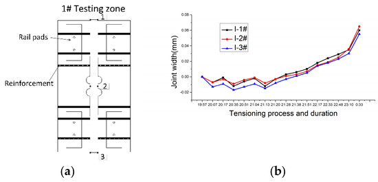 The reinforcement tension in the measured track can cause joint compression at the end of the plate (the break point in the figure). The total compression amount of the joint for the first and second measurement areas after reinforcement tensioning was −0.026 and −0.020 mm, respectively. The shrinkage of the track structure after reinforcement tensioning due to temperature reduction caused the slab end joint to expand obviously. The maximum extension of the track slab joint is close to 0.08 mm when the temperature dropped 5 °C in the actual measurement period from 21:00 to 1:00 (the end of the curve in Figure 8b).