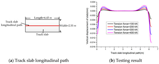 Vertical displacement of the track slab after the longitudinal connecting reinforcement is tensioned. (a) Track slab longitudinal path. (b) Testing result.