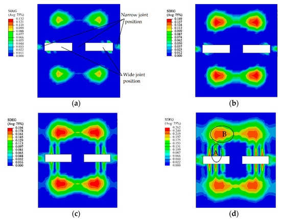 Damage evolution under positive temperature gradient load with different tension force (a–d), 100–400 kN.
