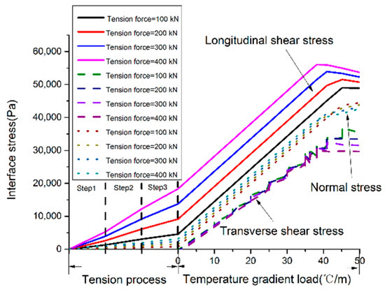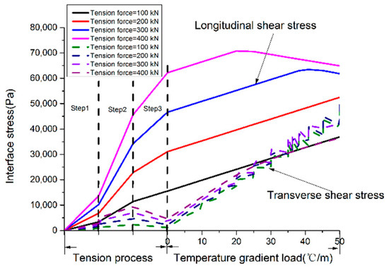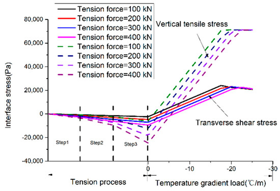 The stress condition of the element node at points A and B are shown in Figure 12 and Figure 13. It is longitudinal shear stress rather than the vertical normal stress and transverse shear stress that is most affected by tension force value. The three-direction stresses of the interface element increase linearly with the increase of positive temperature gradient load. The failure mode at point B is a mixed failure, for its three-direction stress are relatively large. Point A is subjected to 62,200 Pa of longitudinal shear stress when the tension process ends. When the positive temperature gradient load reaches 20 °C/m, Point A begins to appear damaged under longitudinal shear stress and transverse shear stress, so the failure mode at point A is shear failure.