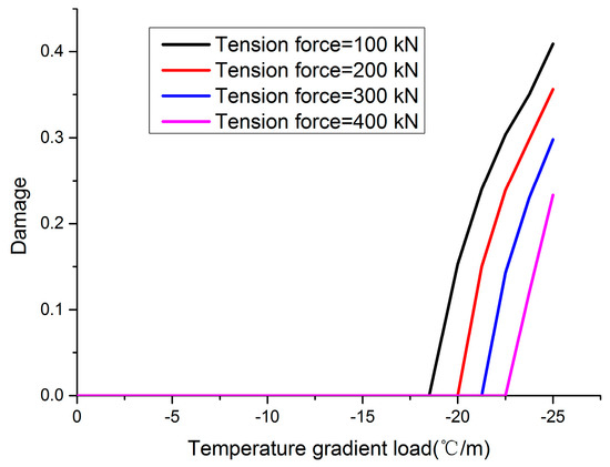 The interface damage areas, shown in Figure 14, are located at the narrow joint position under the action of negative temperature gradient load with different tension force values. The damage value reduced from 0.453 to 0.233, and the temperature gradient load value when the interface damage occurs is reduced from −22.5 to −18.5 °C/m when the tension force value increases from 100 to 400 kN (as shown in Figure 15). The stresses of the interface in the damaged area are shown in Figure 16. Narrow joint position damage is mainly caused by vertical normal stress. The greater the tension force value, the greater the buckle pressure to the narrow joint position. So, the longitudinal tension of reinforcement can reduce the warping of the track slab corner.