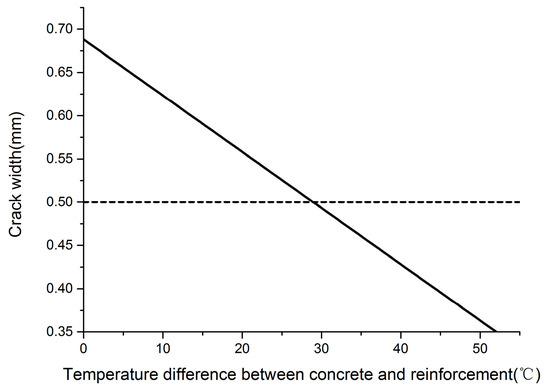 From Equations (10), (11), and (13), it can be seen that the crack width is only related to the value of the prestress generated at the wide joint, while the prestress value is related to the temperature difference Δt inside the reinforced concrete. Figure 17 shows the relationship between the crack width and the temperature difference value between the concrete and the reinforcement. It can be seen that reinforcement and concrete temperature difference value should not be less than 29 °C, to guarantee the crack width is less than 0.5 mm.