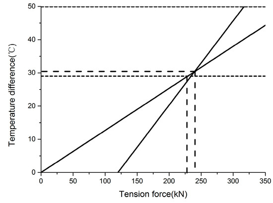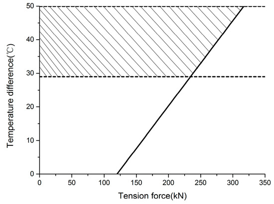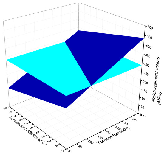 It can be seen from Equations (10) and (12) that the stress of reinforcement is related to the tension force and the internal temperature difference between concrete and reinforcement. Figure 18 shows the three-dimensional diagram of stress, tension of reinforcement, and temperature difference. The stress of reinforcement is directly proportional to tension force and inversely proportional to temperature difference. According to the checked results of crack width, the temperature difference value should be greater than 29 °C. The three-dimensional figure is mapped to the tension in the Figure 18, which is a flat surface temperature difference value under the condition of guaranteeing that the crack width and the reinforcement stress meet the design requirements of tension and temperature range, as shown in Figure 19 (shaded area).
