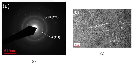 TEM images of the Si/C nanocomposite electrode are shown in Figure 4a,b. The selected area electron diffraction (SAED) patterns show the Si (111) and (220) planes. From high-resolution TEM image, the lattice inter-planar distance (d-spacing) was calculated for Si, and the d-spacing was ~0.32 nm, which is corresponding to the Si (111) plane. It has been observed that the nanocomposite was comprised of nanocrystalline Si, amorphous Si and amorphous carbon. The nanocrystalline Si was distributed on the amorphous silicon and carbon matrix. The amorphous Si phase could also be formed due to amorphization of Si (supported by background broadening in the X-ray diffraction results) for the longer mechanical milling. Amorphous carbon phase could be produced in the form of interface between Si powders and coating on the Si powders from the heat treatment of the citric acid (carbonization). In addition, carbon was expected to diffuse into the Si crystals through surface and boundary diffusion. Such an impregnation of the carbon is believed to be effective to both improve the milling efficiency (refinement of Si crystal size) and act as a mechanically strong (highly elastic) buffering matrix against the Si volume change. However, as shown in Figure 4c, the HR (High resolution)-TEM image of the Si/C nanocomposite electrode at the 100th cycle, a complete amorphization of the nanocomposite powder was observed, which could be due to the stress generated by the Si during the lithiation and delithiation due to extended cycling.