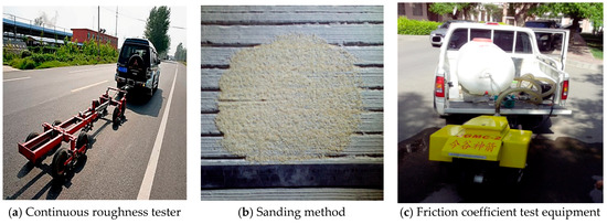 In this study, test methods of concrete pavement texture are shown in Figure 1. During the testing, the pavement roughness is measured by a continuous roughness tester (LXBP-3, Changsha Instruments Company, Changsha, China). Meanwhile, the macrotexture and microtexture are tested by the sanding method and friction coefficient test equipment (JGMC-2, Beijing JinGuShenJian Measuring and Control Technology Institute, Beijing, China), respectively.