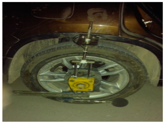 The on-board sound intensity system (Figure 2) is a useful method in tire/road noise testing for measuring the noise level of each test section. The test vehicle ran at a constant speed of 60 km/h. Dewesoft 7.0 (DEWEsoft, Trbovlje, Slovenia) and Coinv DASP ET software (v2005, China Orient institute of Noise and Vibration, Beijing, China) were used to collect and analyze the noise characterization, respectively, and the frequency of collection was 10,000 Hz.