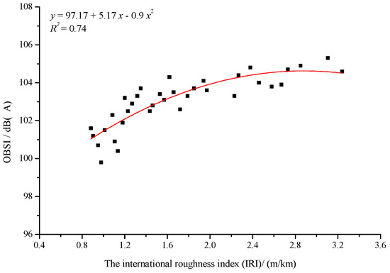 Before the statistical analysis, the measurement data of pavement roughness must be revised to eliminate the obvious systematic errors such as the effect of concrete pavement joints. Then Origin Pro 8.5 was used to perform a regression analysis between the international roughness index (IRI) and the tire pavement noise level. The statistical results are shown in Figure 3.