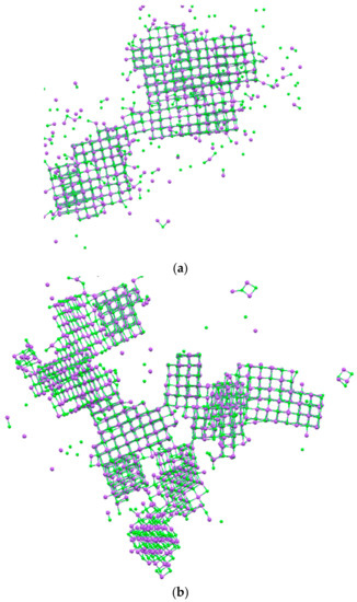 Here, both water molecules and polymeric membranes are not shown. After 5 ns of simulation, several crystals with small dimensions were distinguishable. So, a distinct order among the ions existed (Figure 7a), although the nuclei were immersed in amorphous NaCl agglomerates (disorder), showing that the crystal structures were not completely stable yet. After 20 ns, larger crystals were found and the central part of the system appeared to be stable (Figure 7b). This reveals how rapidly the crystals grow over time, such as to form significant aggregates even at 20 ns. At 100 ns of simulations, stable crystals are made with few free ions available in the solution (Figure 5c).