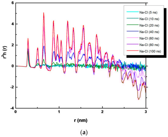 The analysis of the dimension is reflected by the analysis of the g(r). At 5 ns of simulations, one sharp peak and a second peak, less resolved at larger interionic distances referring to the increased spatial ordering of the ions, are visible. The evolution of the g(r) at 20 ns indicated well-defined peaks demonstrating nucleation and spatial ordering of the ions as reported also for the NaCl bulk solution at different concentrations [62,63]. A similar g(r) plot appears at 100 ns as indicated by the crystal dimension at 20 ns (Figure 7b) and at 100 ns (Figure 5c).