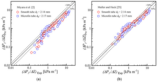 To validate the experimental procedure, the experimental frictional pressure drop data of the microfin and smooth tube were compared with the four pressure drop correlations proposed by Miyara et al. [2], Muller and Heck [25], Haraguchi et al. [26] and Olivier et al. [27], as shown in Figure 8. The compared frictional pressure drop correlations are listed in Table 3. The average deviation (AD) and mean deviation (MD) are listed in Table 4 and calculated by Equations (11) and (12), respectively. All correlations were well predicted for smooth tube data, but the microfin tube data were not predicted well.