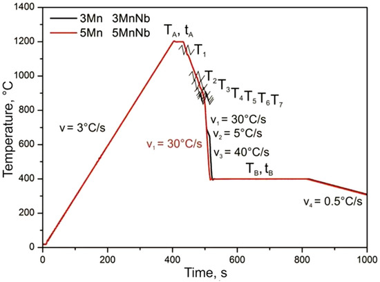 The investigated steel was melted in a Balzers VSG-50 vacuum induction furnace under Ar atmosphere. After melting and casting, the ingots were hot forged between 1200 to 900 °C. The specimens 15 × 20 × 35 mm for the thermomechanical processing using the Gleeble 3800 simulator were prepared. Detailed information on deformation conditions performed in 7 steps (T1–T7) in a temperature range 1200–850 °C (Figure 1) was listed in work [8]. The 5Mn and 5MnNb steels were continuously cooled to the bainitic transformation temperature TB and isothermally treated in temperatures: 350, 400, 450, 475, and 500 °C. The duration of isothermal holding was: 300 s, and for 450 °C it was also 60, 600, and 1800 s, respectively. The aim was to determine the effect of isothermal holding time on the thermodynamic stability of retained austenite. 3Mn and 3MnNb steels after deformation were cooled according to the parameters given in Table 2. The duration and temperatures of isothermal holding at the bainitic region were the same as for 5Mn and 5MnNb steels (Figure 1).