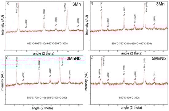 (a) X-ray diffraction pattern of 3Mn type steel isothermally held at 350 °C for 300 s; (b) X-ray diffraction pattern of 3Mn type steel isothermally held at 400 °C for 300 s; (c) X-ray diffraction pattern of 3MnNb type steel isothermally held at 400 °C for 300 s; (d) X-ray diffraction pattern of 5MnNb type steel isothermally held at 400 °C for 300 s.