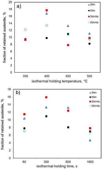 - The optimal time and temperature of isothermal holding for all the steels were 400 °C and 300 s, respectively. Under these conditions, 16–18% of γ phase was obtained for the 3Mn type steels, whereas 10–13% of retained austenite was detected in 5Mn type steels. The amount of retained austenite was similar for the steels with and without Nb microaddition;